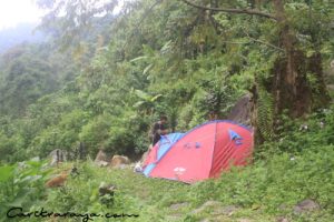 Tim Caritra Raya bertolak dari jakarta ke Jonggol sore hari sehingga sampai lokasi kondisi hari sudah malam, dingin dan berkabut. Dari gerbangnya jelas tertulis wahana wisata ini dibawah pengelolaan perhutani, masuk ke lokasi kemudian singgah disebuah warung dan memesan kopi untuk penghangat dan penyemangat sebelum mendirikan tenda. Walau minim fasilitas penerangan di malam hari, kami yakin lokasi tracking menuju air terjun tidaklah jauh, karena sayup-sayup terdengar gemuruh air terjun dari lokasi camping ground.